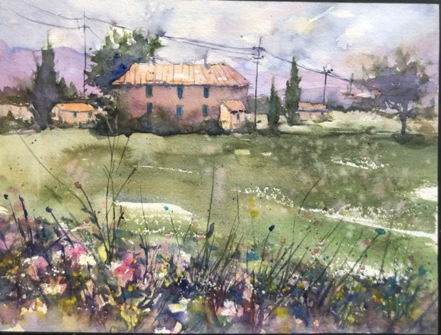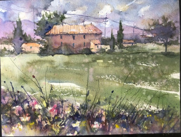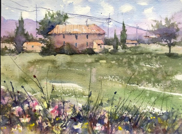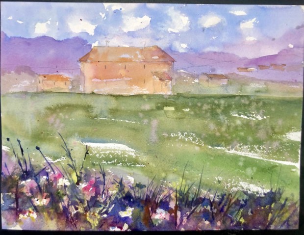Quitting now. I worked on my sky a bit. And splattered a lot with white gouache, cad yw, opera, and some Joe’s Andrew’s Turquoise. Softened a few edges. Lightened a few spots that had gotten too wet to paint the bushes on and gone dark.