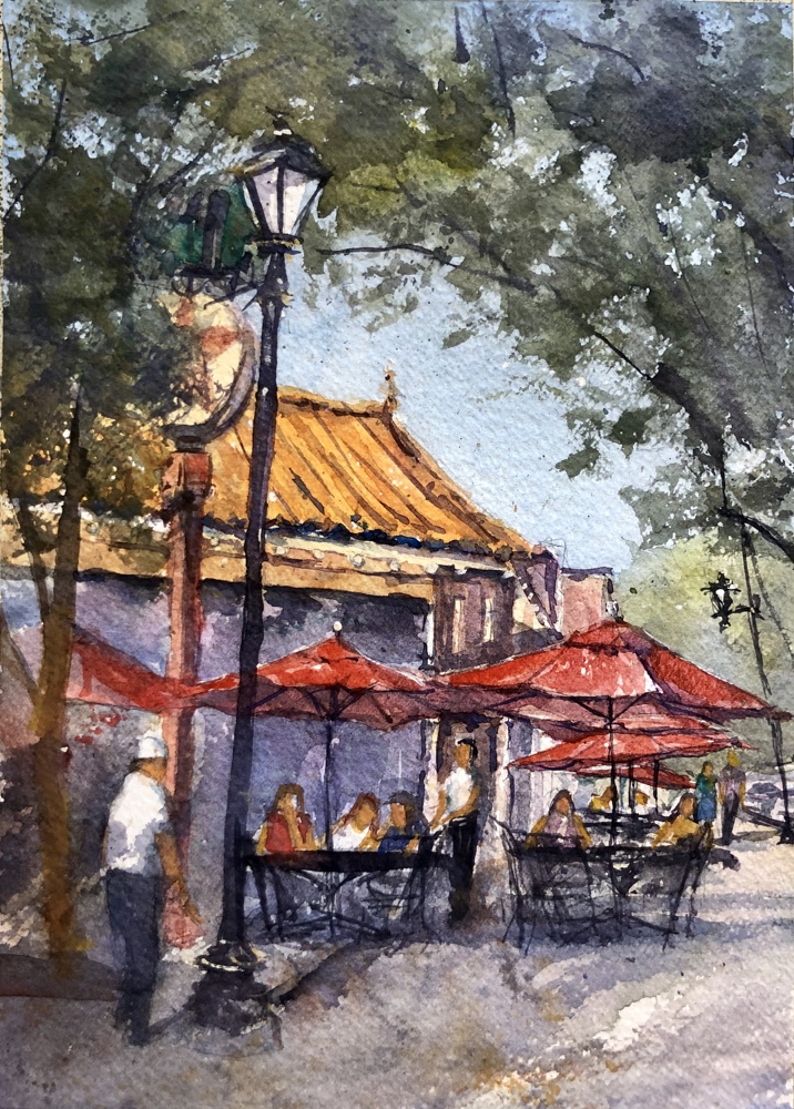 Laying in some watercolor. Got a little too dark with the ultramarine and burnt sienna on the roof at this stage. Ultramarine, Burnt Sienna, Yellow ochre, a dab of cad red and cobalt teal.