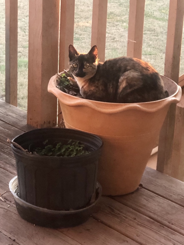 It’s time for pot kitties again. They have grown a lot. Halley looks gorgeous with an orange glow from the sunset on her back.