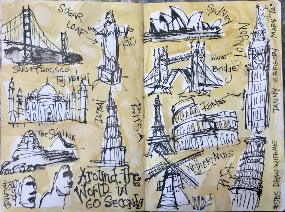 Drawing each icon of their country for 60 seconds each with Danny Gregory today on YouTube. He had a slide show of each of the icons that let you view it for 60 seconds. Then on to the next one.
