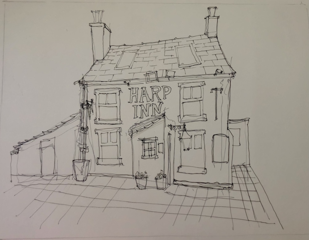 A quick sketch with my light grey Tombow pen – the pointy end. The lines are all slightly tilted. Nothing is square in the drawing though in reality the inn is square aka plumb.