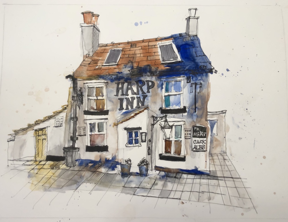 To draw the Harp Inn on the River Dee with Ian Fennelly and Sketchbookskool. A lot of fun but like chasing a greyhound painting with Ian.