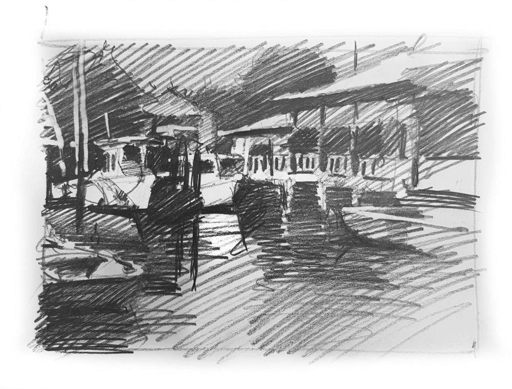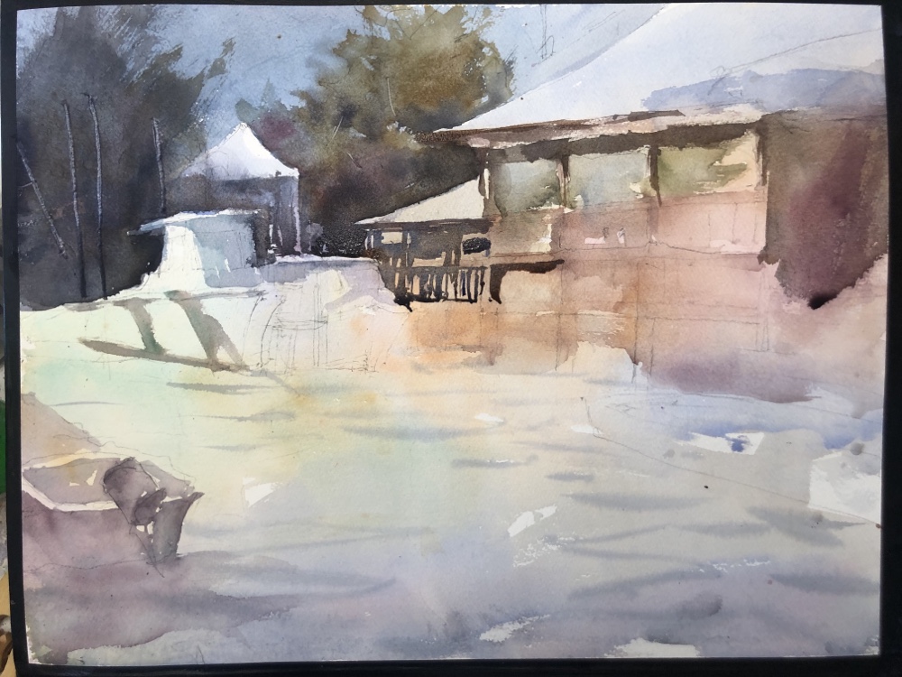 Wires and lines dark darks. People in the restaurant. And there’s that wash I didn’t Finish. That hard line is going to be difficult to fix.