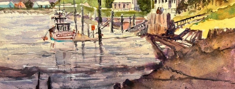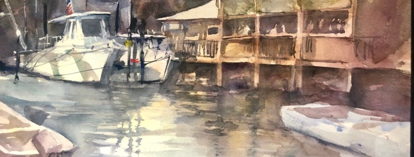 And now they are really showing up. Why did I forget to paint the back end of the left boat. Duh. The things you do when madly painting. And how did I twitch the one piling on the building to make it crooked?! A real duh. Hate things like that.