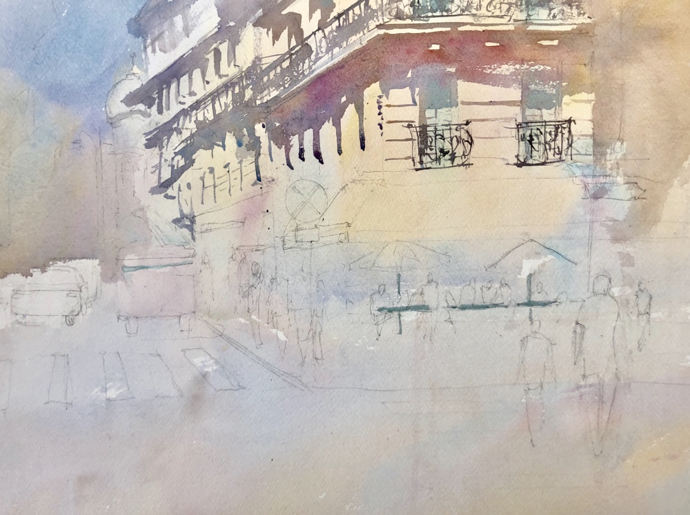 Wires and lines dark darks. People in the restaurant. And there’s that wash I didn’t Finish. That hard line is going to be difficult to fix.