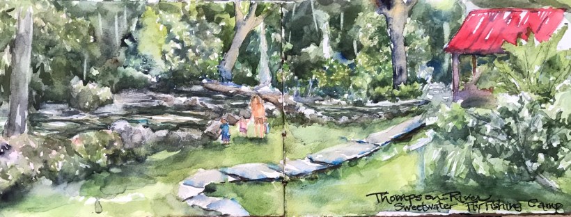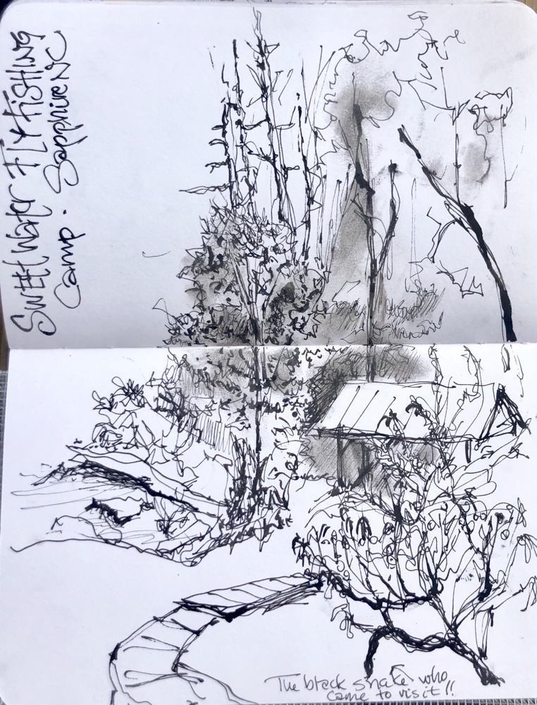 The view from where I sat and drew today. You can rent it on VRBO Sweetwater Flyfishing camp. Bytw my son and grandson pulled five trout out of the river in a half an hour today. One was a foot long rainbow. Yummm.