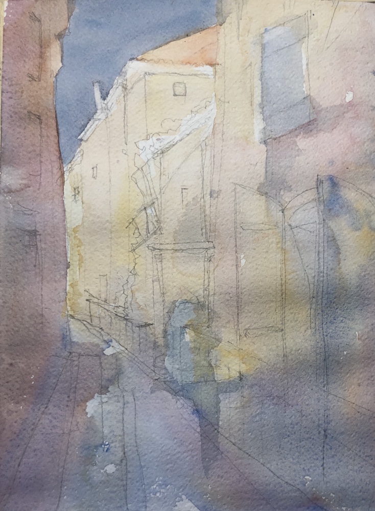 Light washes of yellow ochre cobalt and dioxzine and alizarin.