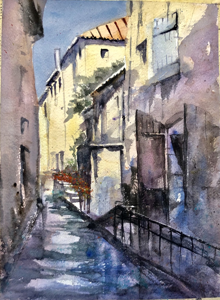 Had fun drawing white lines on it with my white pentel gel pen. It easily lays down a really white covering line. If it’s not getting entered in a Watercolor Show doesn’t matter if it’s gouache or gel pen does it?! Yesterday. I added ALOT OF DARKS today and tried to finish the water. A few more windows and darker ones bigger shadows more shadows. Greyes the power pole down. Built a fence and a dock well sort of.