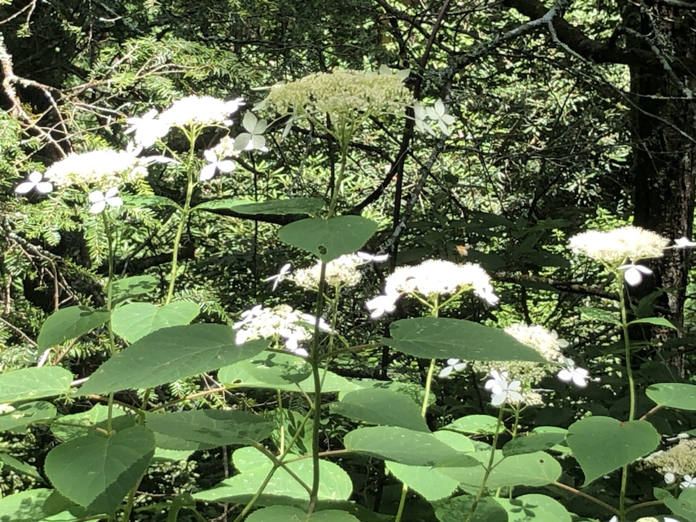 Wild lace cap hydrangeas line the riverbanks the road and the hiking trails.