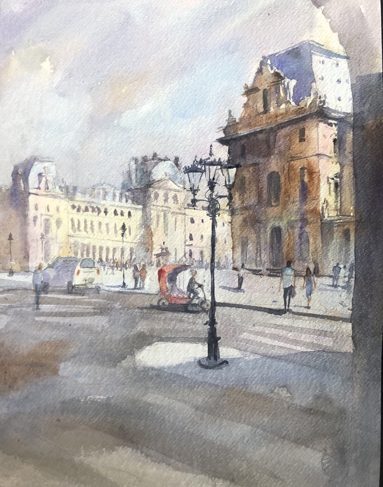 And the washes are piling up. Pointy brush w Paris grey to the Eiffel Tower and the Pont Alexander.