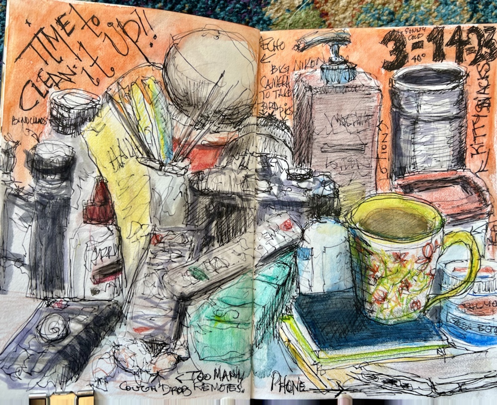 First layer of watercolor. Four colors. Winsor Newton Brown Madder, WN Cerulean, WN Prussian Blue, and M Graham Azo Orange. Oh a dab of ivory black used as a grey.