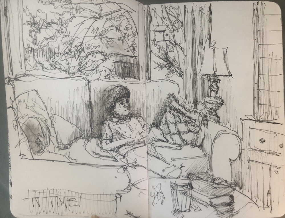 I should add an egret cruising in to this drawing. There are at least 100 egrets cruising in now to roost under the windows in the trees that I didn’t draw in this sketch.
