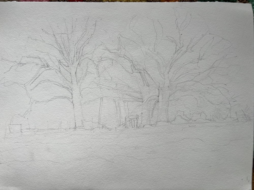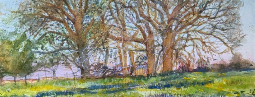 Somewhere in the Texas hill country the bluebonnets are blooming. 11×15 fluid cpThe image. Swiped from @ericrhoads who held the worldwide pleinair last Thursday. That was so much fun they are doing it again. 4300 people showed up for it. There was even a group in England staying up late to join in. Somehow i dont think he will mind. Hmm somehow i lost the glow in the foreground. Oh well. I nailed it on the big trees. The sketch. First wash. This is a graded wash. You wet the area to be washed aka the sky in this one. Start at the top with thalo blue and cerulean and donβt add more color til the bottom when i added a shot of quin rose. Gives a really nice sky that lightens toward the bottom. Here it is loosing its sheen. I forgot to take one of it dry sorry.When i ran out of steam last night. as usual the colors are OFF. Does not matter where or how i take it they are off. Hmm maybe i should try my big camera. Its much darker and has lost alot of transparency.