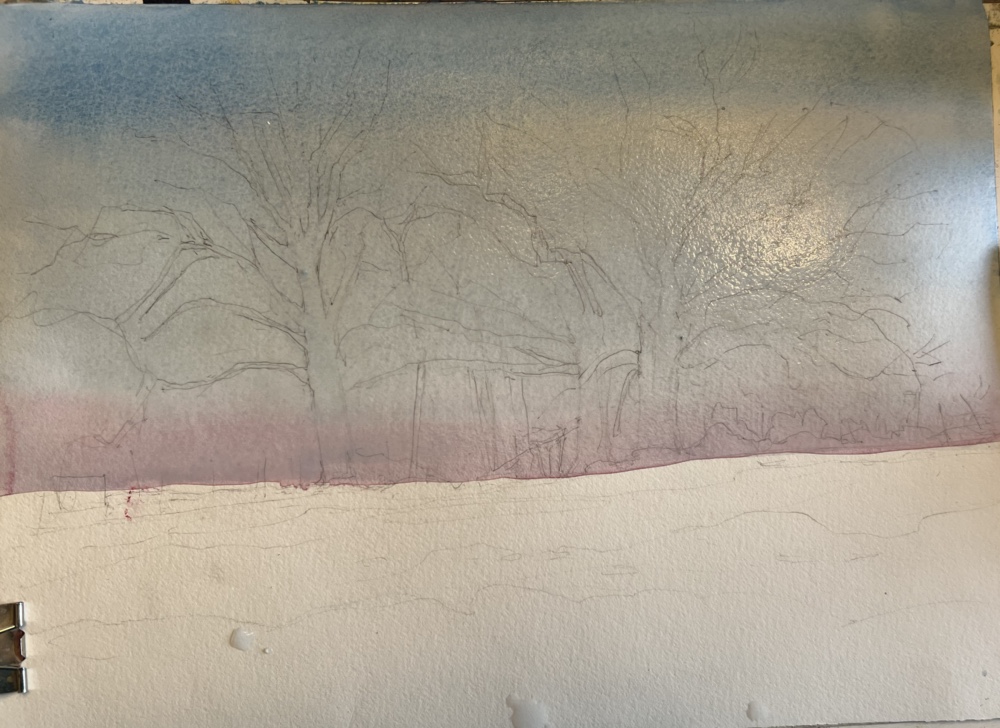 What would I work on?! Less striped sky. Better firs. But all in all I like it. Masking the birch trees to preserve the whites before I started painting.