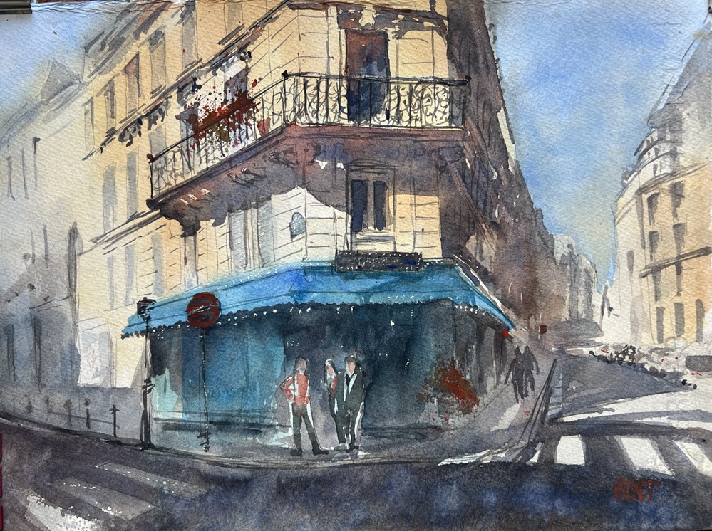 The drawing. Needs some tweaking. First wash. Soaked the oage the. Added a cobalt sky, ultramarine and burnt sienna grey with a touch of alizarin for spring warmth according to Alex Hillkurtz leading the paint along. Raw Sienna and Burnt Sienna on the buildings Thalo blue awning and windows. Funny how that bright blue disappears as the painting develops. Adding darker greys same combo Building details that grey adding orange for reflections. Lots of details added. Loved doing the balcony. And i always love drawing the lines on the buildings. really like these people. And could not resist the urge to add flowers on pots. Always in for a bit of splattering. Something liberating abt splattering. Have to say that Alex Hillkurtz is a thoughtful teacher who loves Paris so much he moved there eight years ago. Have to agree its a magical spot. if u want to take a class from him he teaches on Domestika. Reasonable prices $10-15. Also does. Painting tours in other spots. He does great explanations leaving out nothing.