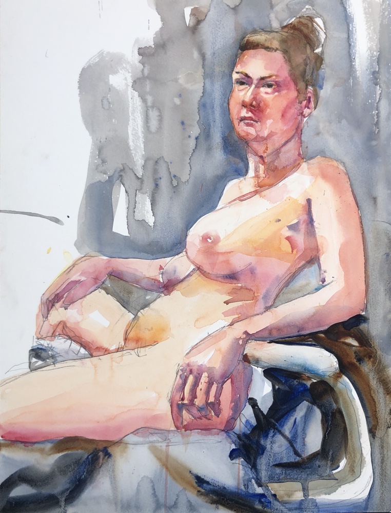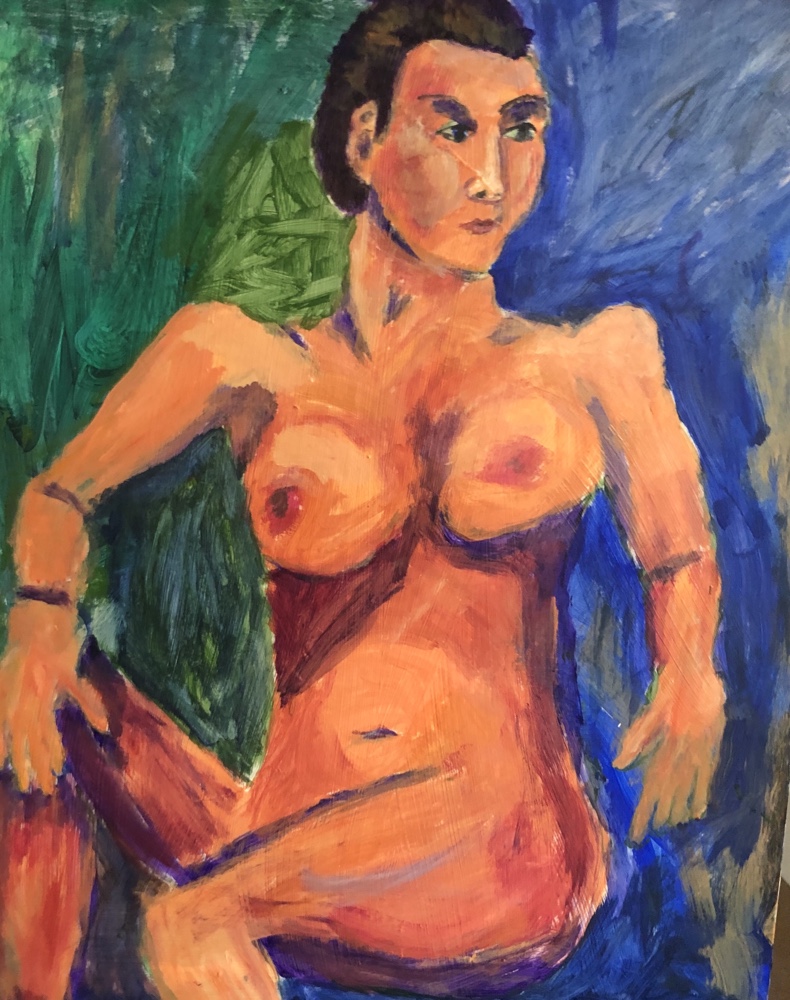 Colors used cad red light cad yellow light cad orange alizarin cobalt Cheap Joes Andrews turquoise and mineral violet. Hair ultramarine and burnt umber but needs to go darker.