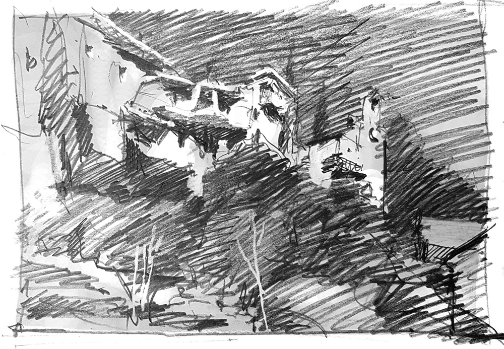 Then the far background trees and some on the left which I managed to paint out. Oops.