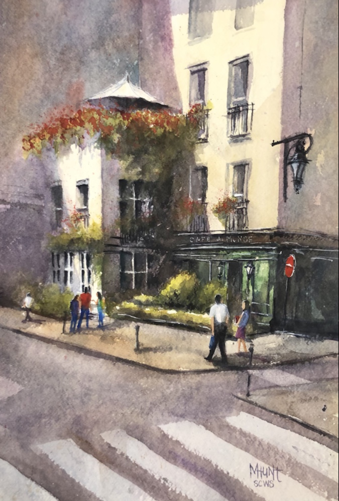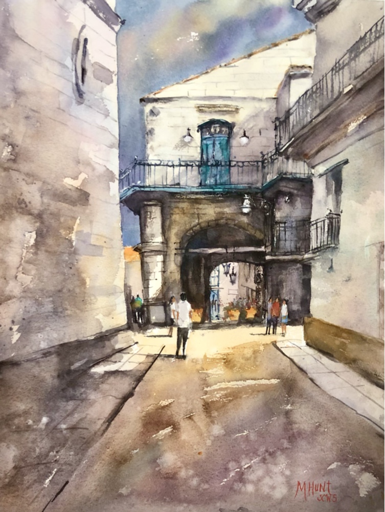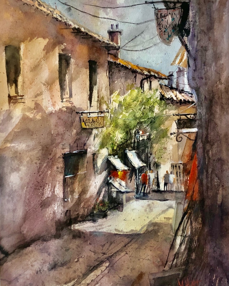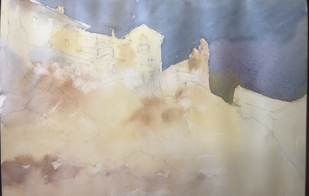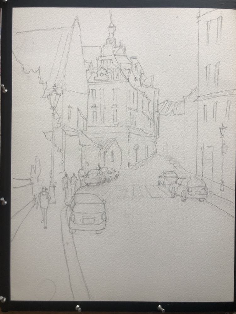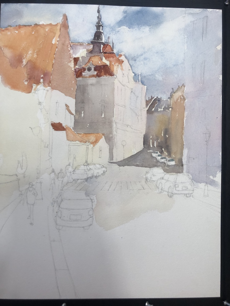 Thinking it might be done. Prague! Paint along with Vladislav Yesileyev. Love the Hahnemuhle paper. It makes the colors sing. And so easy to wipe away a mistake not that I would make one. 🤣