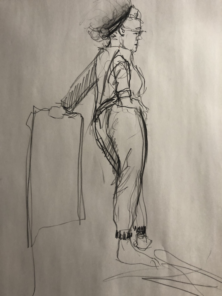 Our model was late so Joya nimbly volunteered to model for our gesture sketch session.