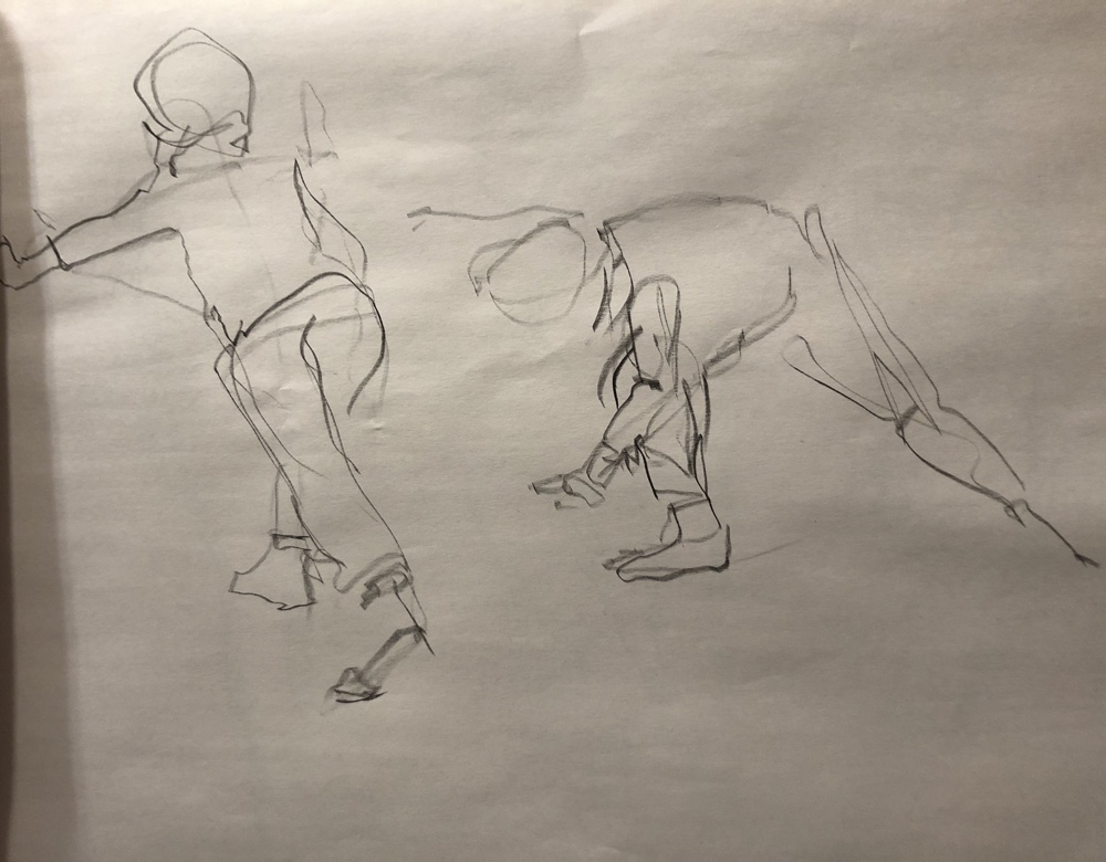 First up 2 min gesture sketches done w Caran d’ache neocolor ii on a big sheet of newsprint. 8×24”