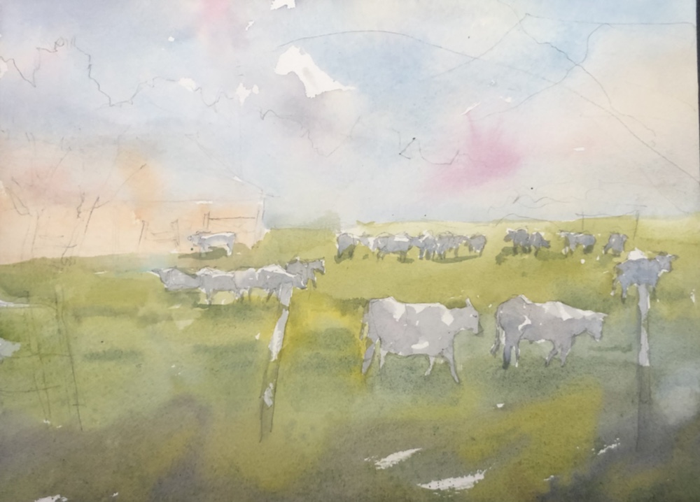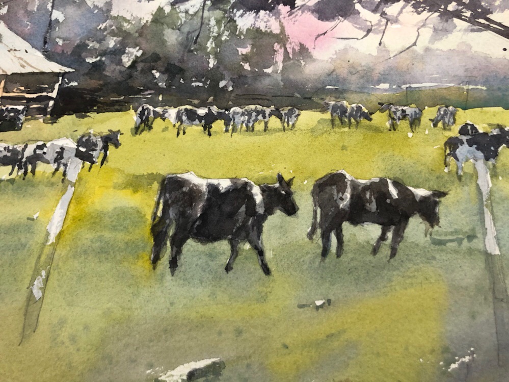My sketch. Did get tired of drawing a jillion little cows and all those legs. 😜 My dad used to joke to us on trips to count the cows by counting their legs and dividing by 4. That was the best part of drawing a jillion cows. Remembering the joke.