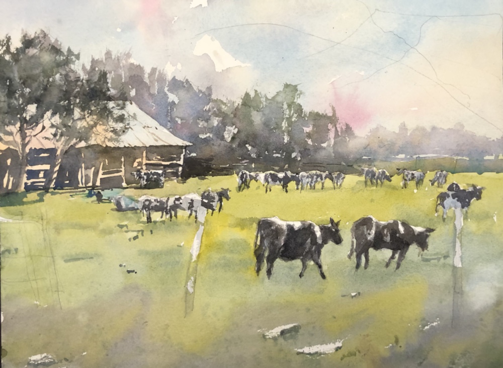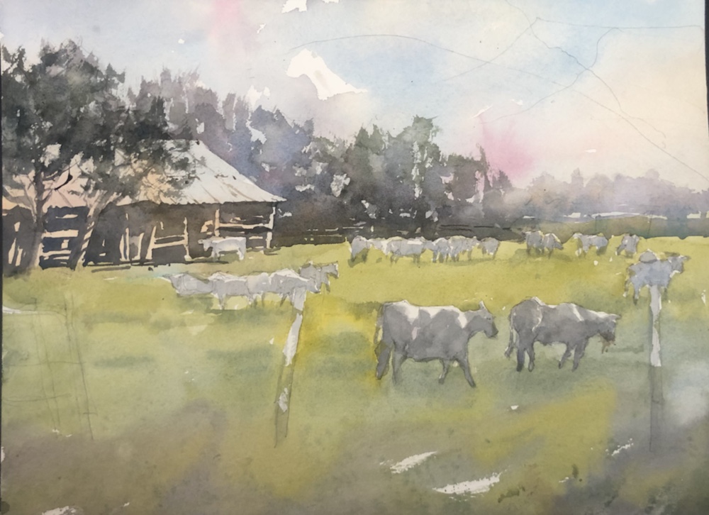 So I painted my cows a little darker grey. Cobalt yellow ochre and alizarin dioxzine mix. That mix will give you all kinds of grey.