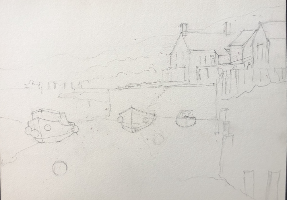 The black and white sketch done with my micro uniball pen. In some ways I like this better. The grassy area bothers me a bit.