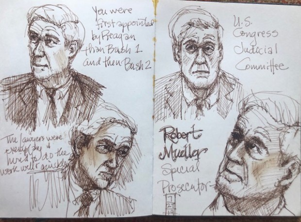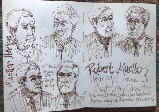 A sketch of the cute bungalow next door. To say it’s a cottage is a misnomer. It’s big. Really big. The roof is rolled like one on a British cottage. Peachy brick with yellow ochre trim.