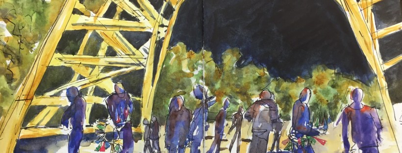 The dark sky was painted TWICE Inathrodone and burnt umber mixed. Let it dry between coats. If this were not in my sketchbook I might paint it again. Last I added shadows where the girders crossed.