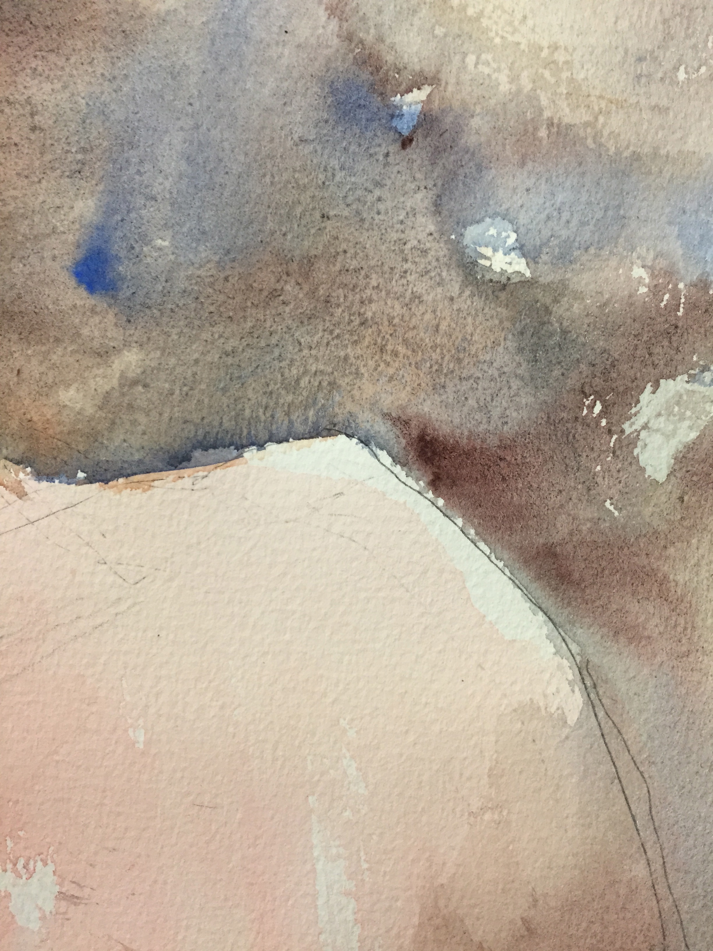 Flesh color laid on. Quin coral and French ochre whichbare both transparent. Also shadows of cerulean and quin burnt sienna. Hair ultramarine and quin burnt sienna.
