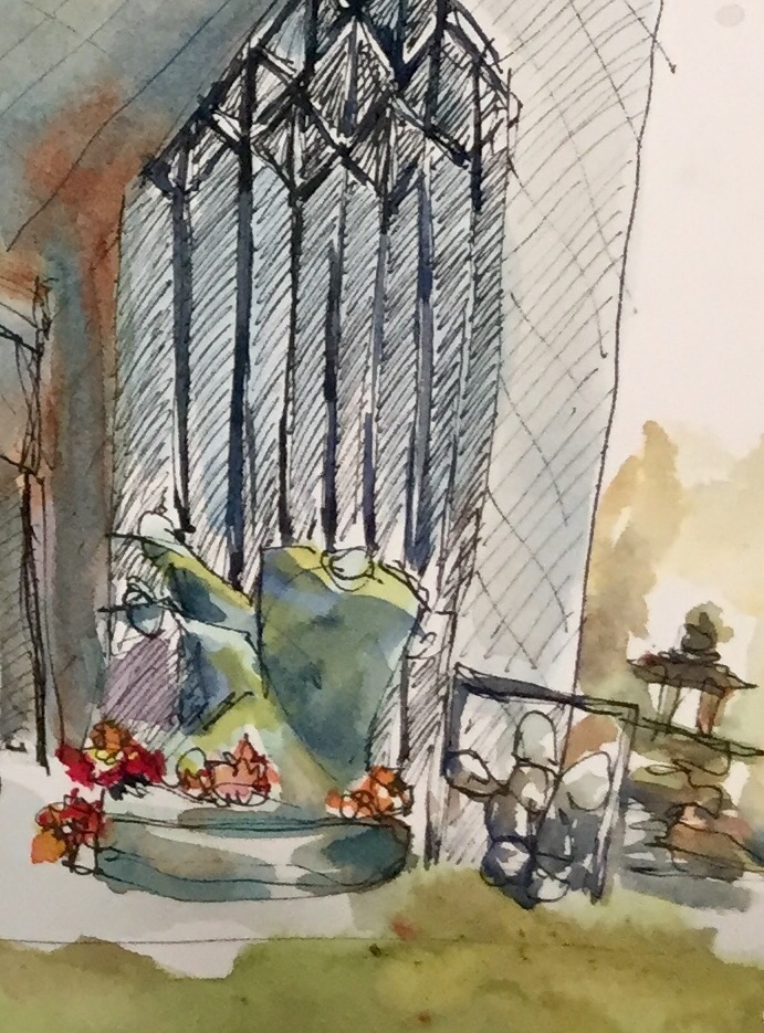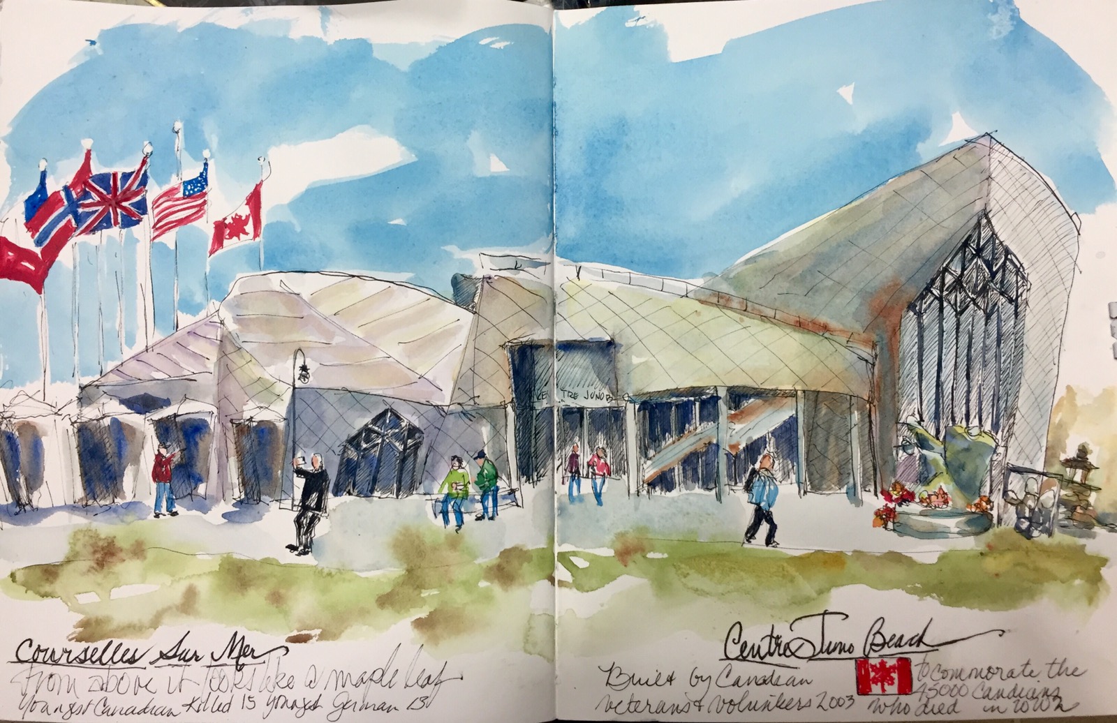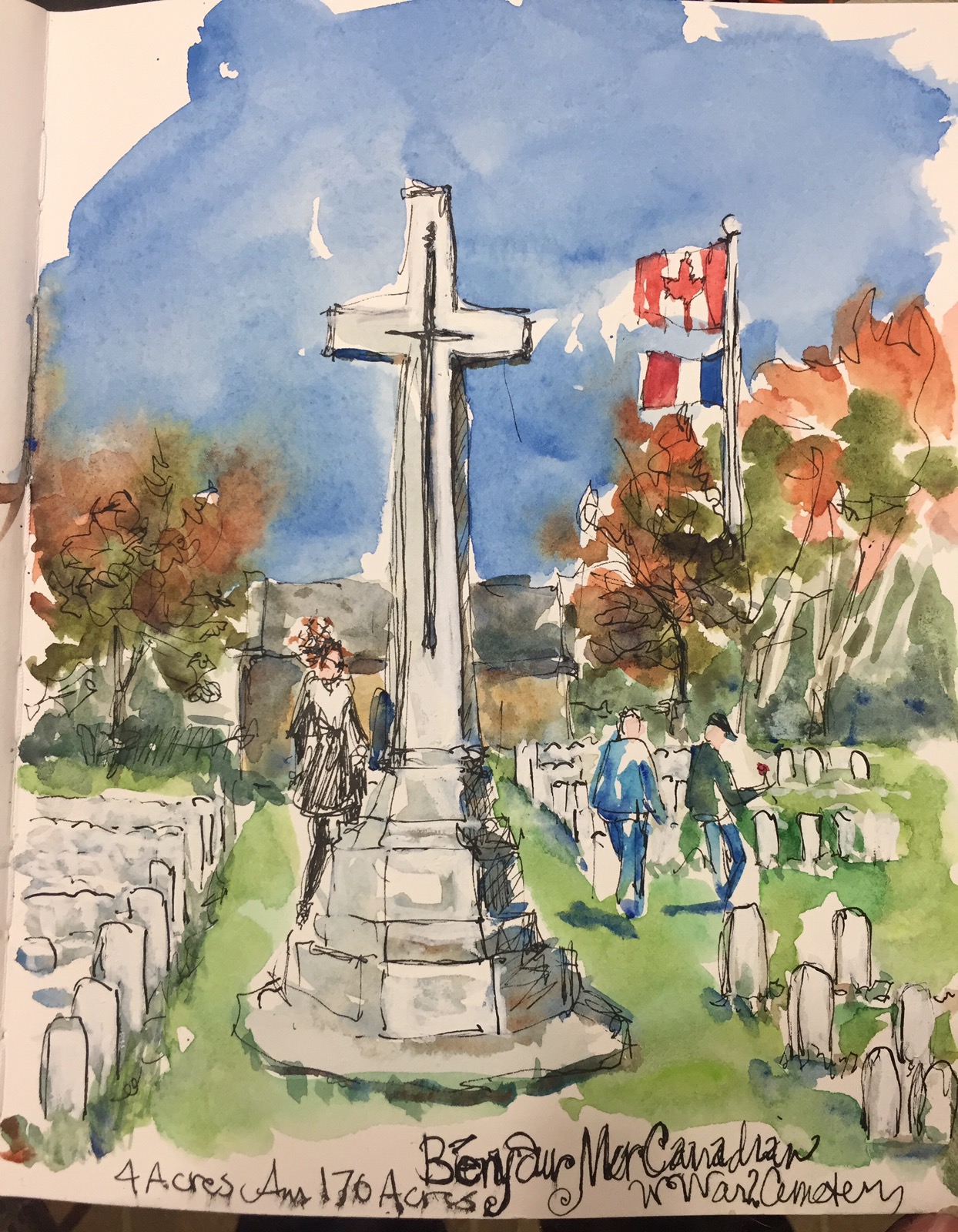 The French in Normandy seriously love Americans because they know we saved them. This is a sketch of one of the Canadian cemeteries at Birn Sur Mer. We were there on Veterans Day and many of the people on the tour had uncles buried there leaving roses on their graves.
