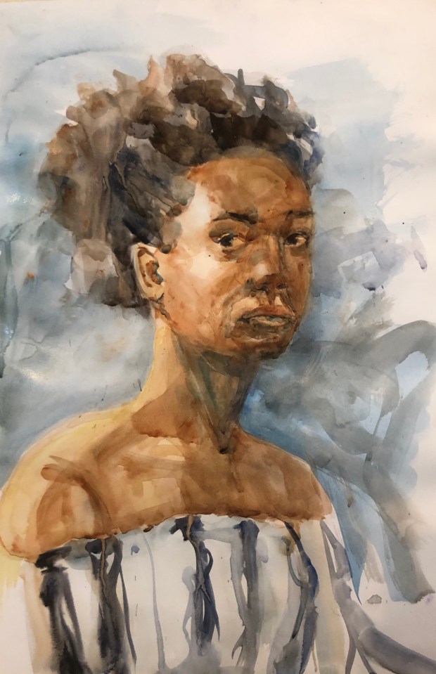 First break. NO pencil. 😵😵😵Rough block in on Co fluid watercolor paper. 140#. The paper is really a bargain for great paper. Six full sheets for $24 on amazon. Always dries just about flat no matter how soppy wet I get it. Second break not making a lot of progress. Adding more darks and the blouse. Lack of progress I think that was due to the continually rotating head. No excuse for that left eye. But an easy fix on this hp. Most hot press would not let you move it at all. One shot and you are done. Last break. That left eye shoot me. But I brought it around. Add more darks to the hair which was ultramarine and burnt umber or van dyke brown. Also I didn’t want to get the shadows dark since that would age her. She has quite a very young face. Deep shadows age people in portraits especially babies. For now. I have a to do to her list. May or may not do them. BYTW her blouse was painted in two shots with my size 16 Cheap Joes sable. First was a glaze of very watery cerulean and burnt sienna. Then after it was dry lines of the black hair mix.