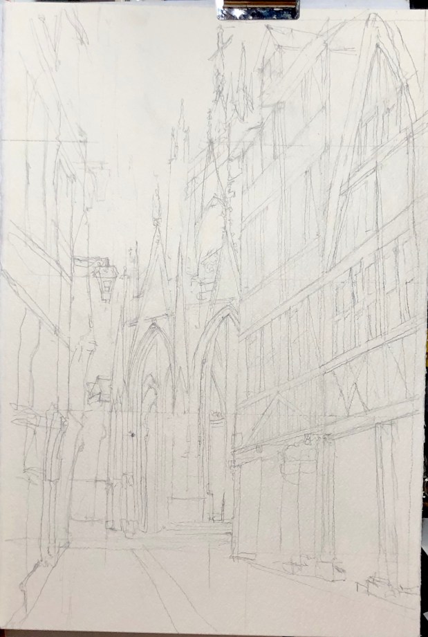 Before I darkened the sky to make St Maclou pop. I also added a red orange mix – cad red light and cad yellow light – to the church door to demand your attention. Aka focus your eye.
