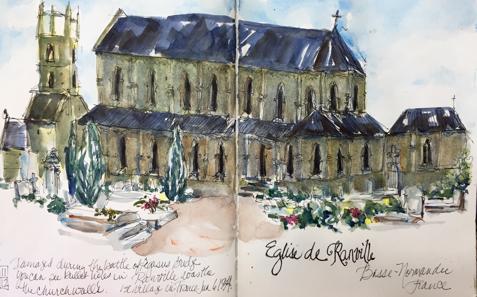 Margaret xoxoxo whose going to listen to old WW 2 movies on TCM while she paints. #usk #urbansketcher #traveljournal #watercolor #aquarelle #ink #strathmore #viking #strathmore500 #arrowmanches #normandy #normandie #normandietourisme #vikingcruises #PegasusBridge #bayeux #Ranville #beny-sur-mer #Rouen #omahabeach #junobeach #dday #alliedinvasion