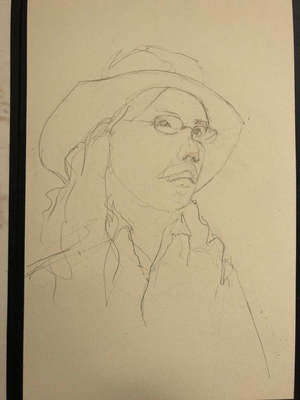 I tried drawing him like the second photo but was not going well at all. So I finally flipped he paper over and drew just his head and shoulders. Still a pain. Long nose huge eyes short forehead. And foreshortening of Head. Eeekkkk.