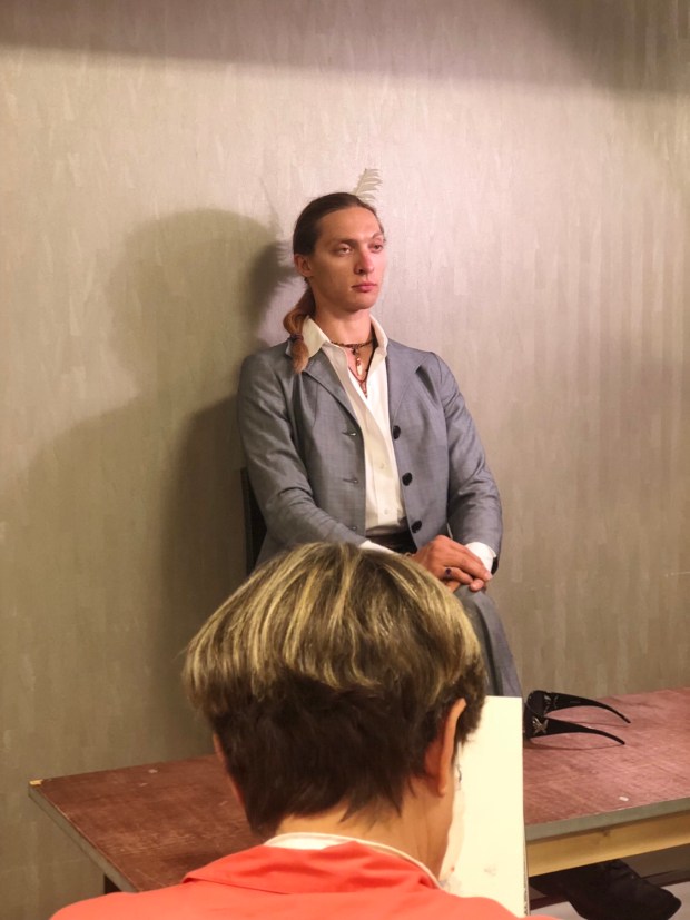 Watching Charles Reid paint a person is like watching someone make magic. He twitches his brush here and here.