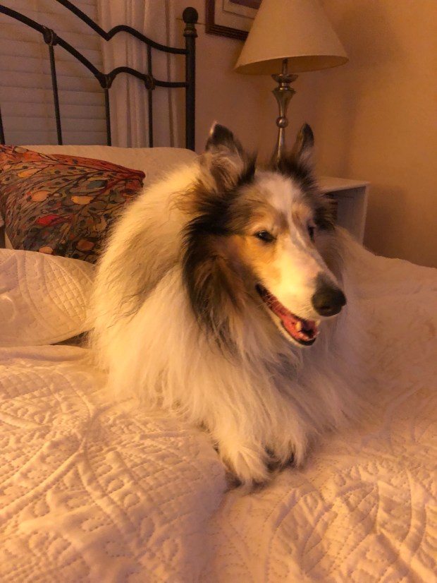 Look who decided to jump in bed with me tonite. My friend Karen’s collie Carly. What a sweetheart.