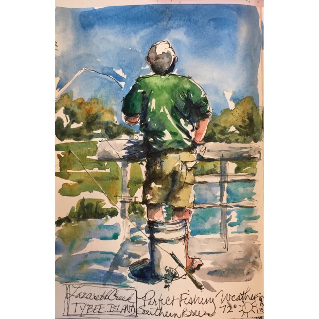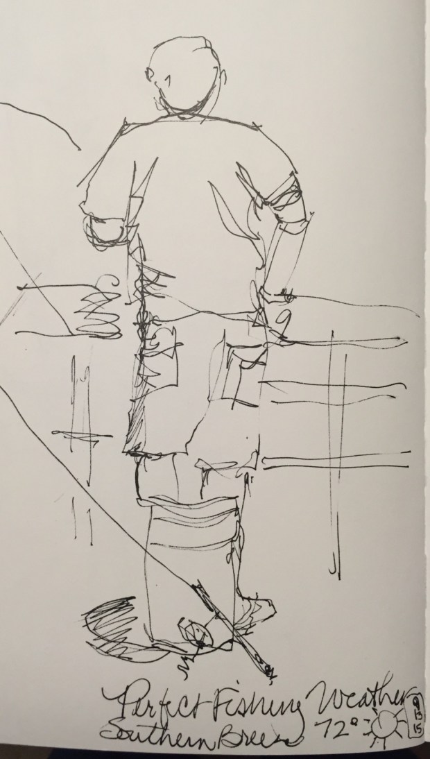 He had noticed me sketching and asked if he could see them. I had been wanting to draw the fisherman but resisted because I might get caught undercover Sketching. As soon as he started fishing again I whipped this sketch off and quickly turned the page. I knew he would not mind.