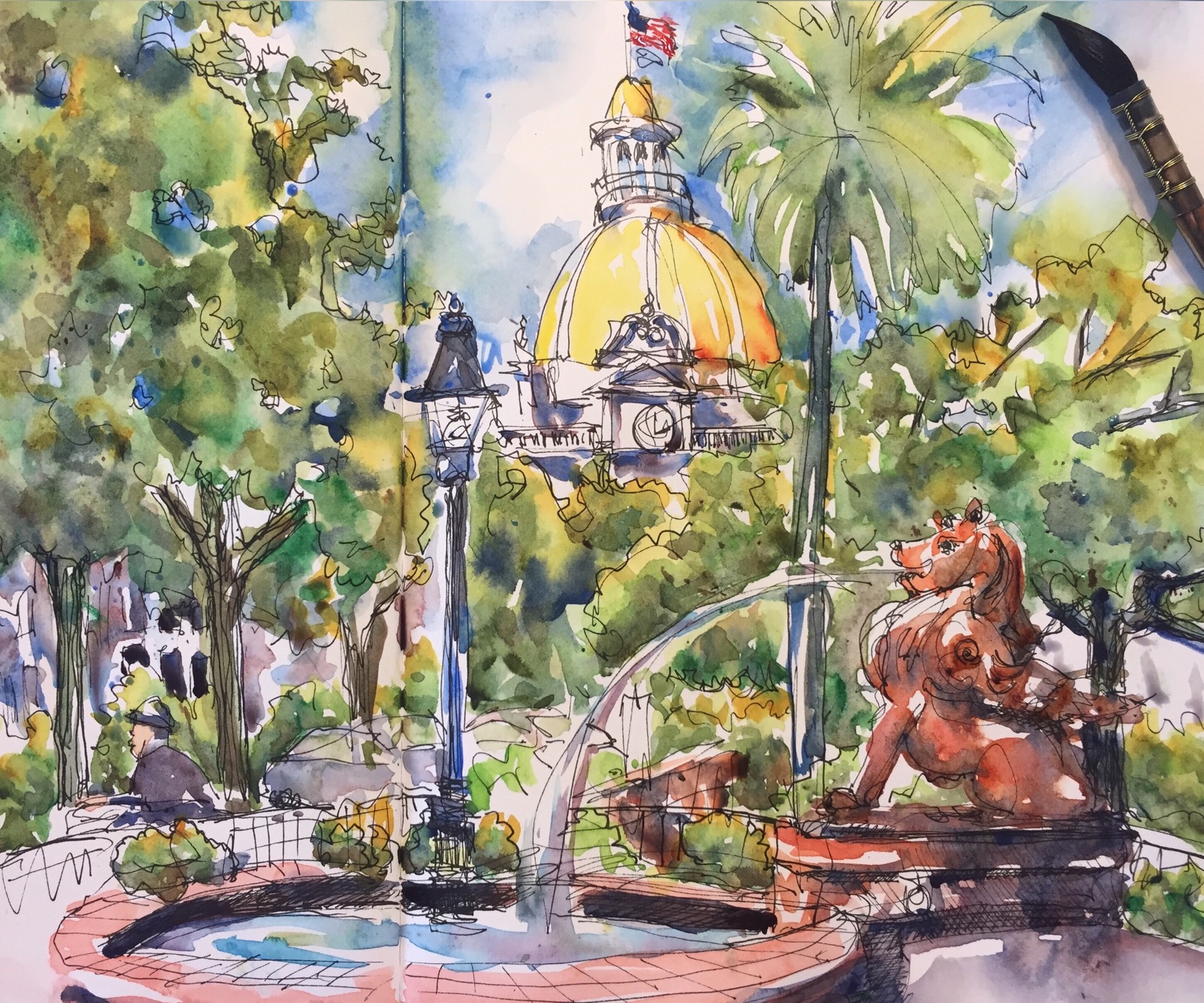 If you like this style of sketching and painting aka urban sketching sign up for Marc Holmes class on Craftsy. Sign up thru his site http://citizensketcher.com/2015/08/29/travel-sketching-in-mixed-media-lesson-sneak-peek-silhouette-shapes/ for a $10 discount. A good deal for $20 and do it at your leisure.