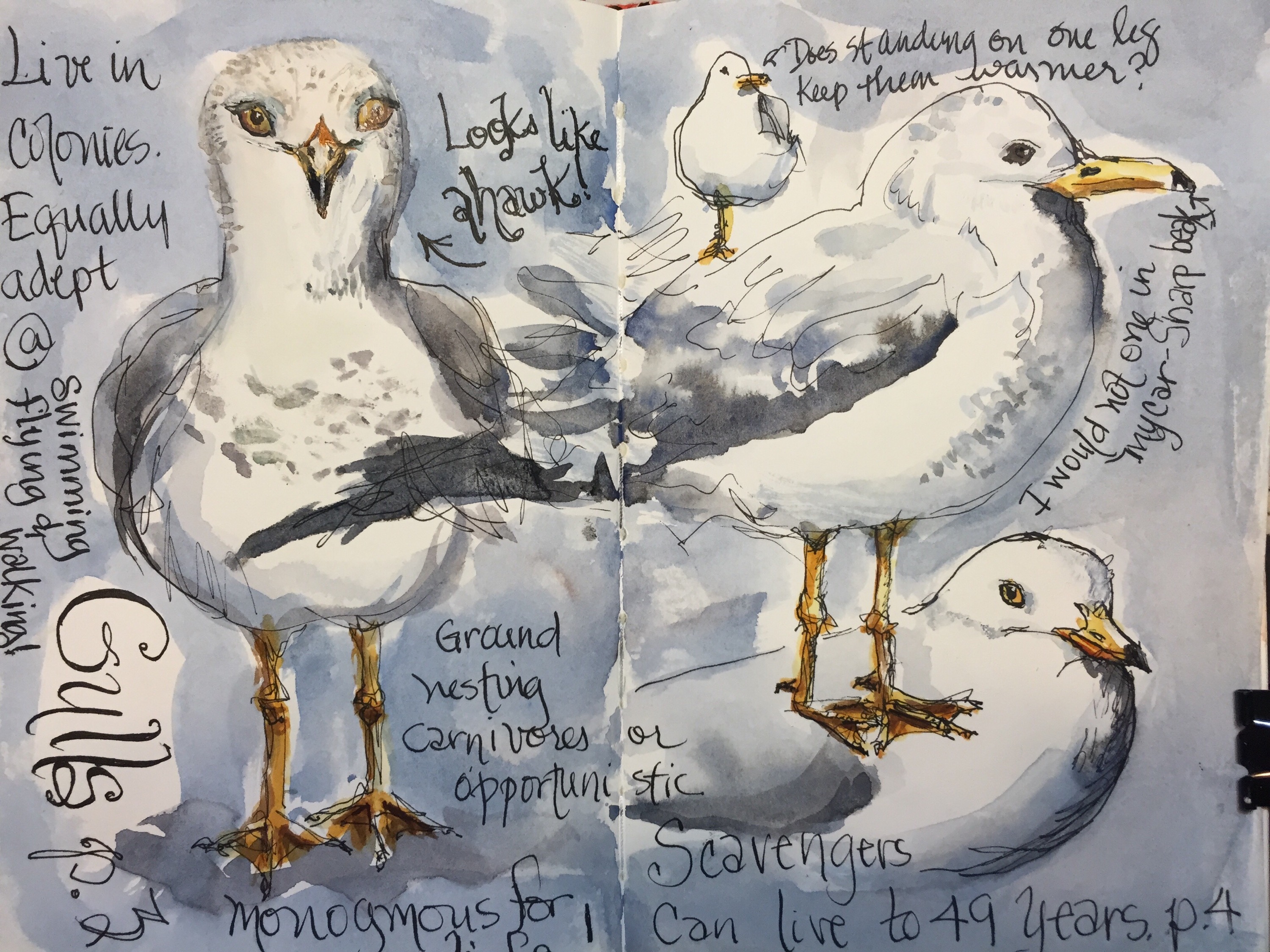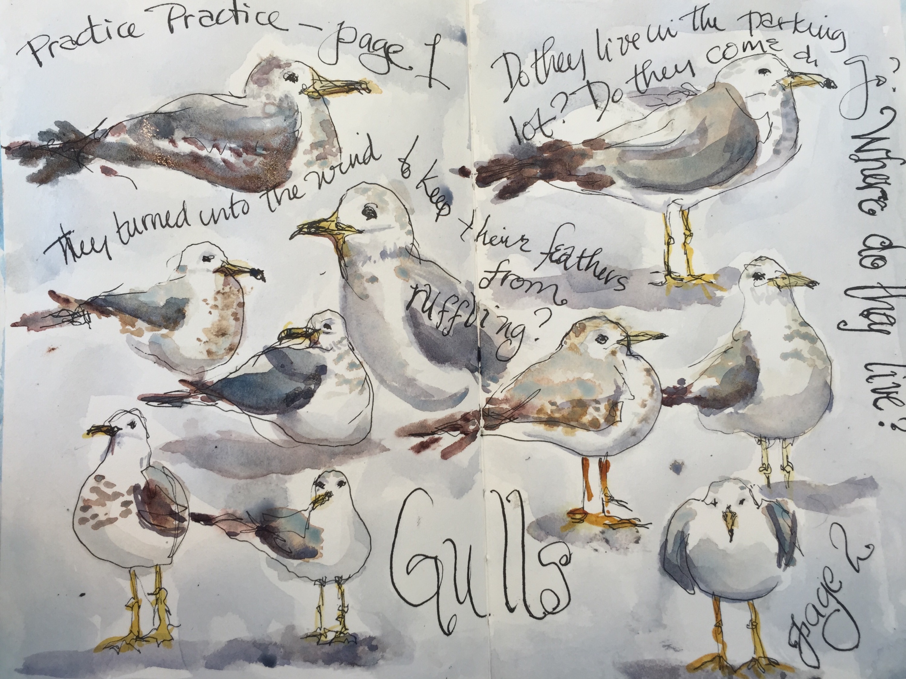 The gulls were in the Target Evans parking lot when I drew them. I did paint them at home.