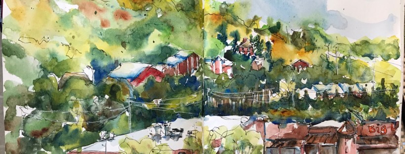 Hahnemuhle journal yellow ochre cerulean cad red light cobalt burnt sienna ultramarine and a dab of quin gold.