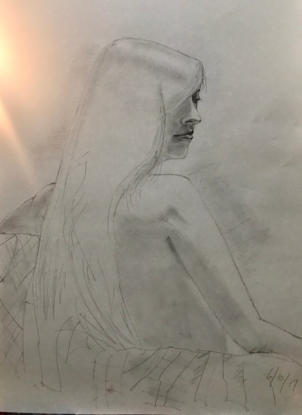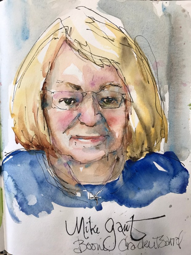 We had a draw off at Cracker Barrel one Saturday or Sunday morning when we were in Boone. Here’s Mike drawing me. Eeek!!