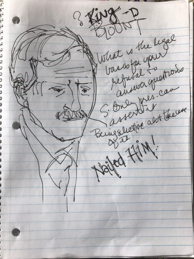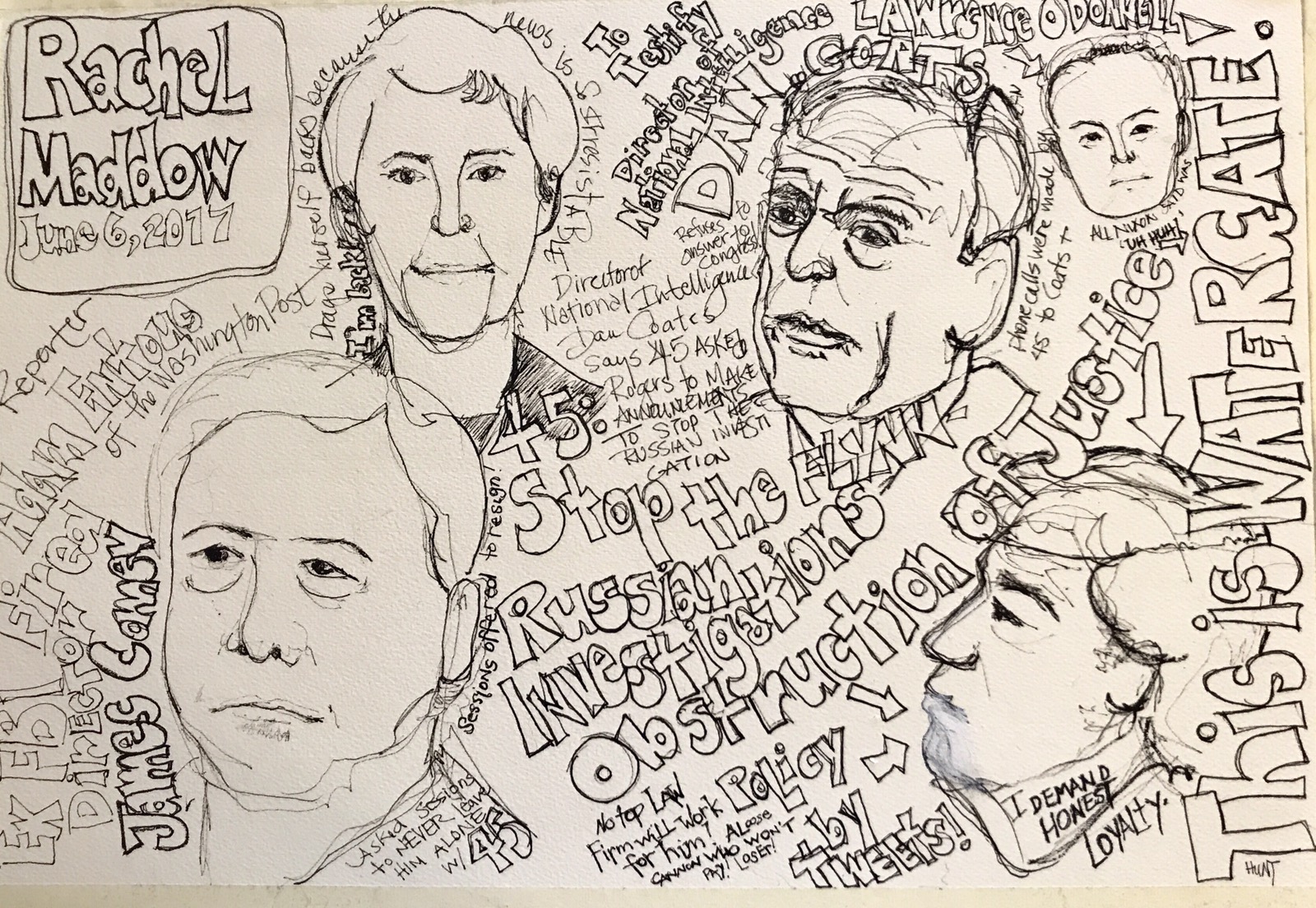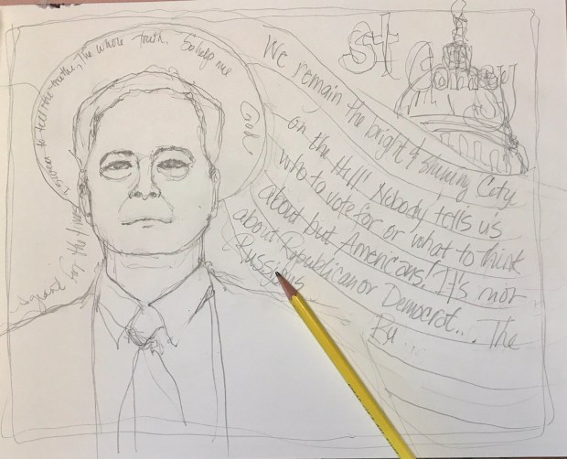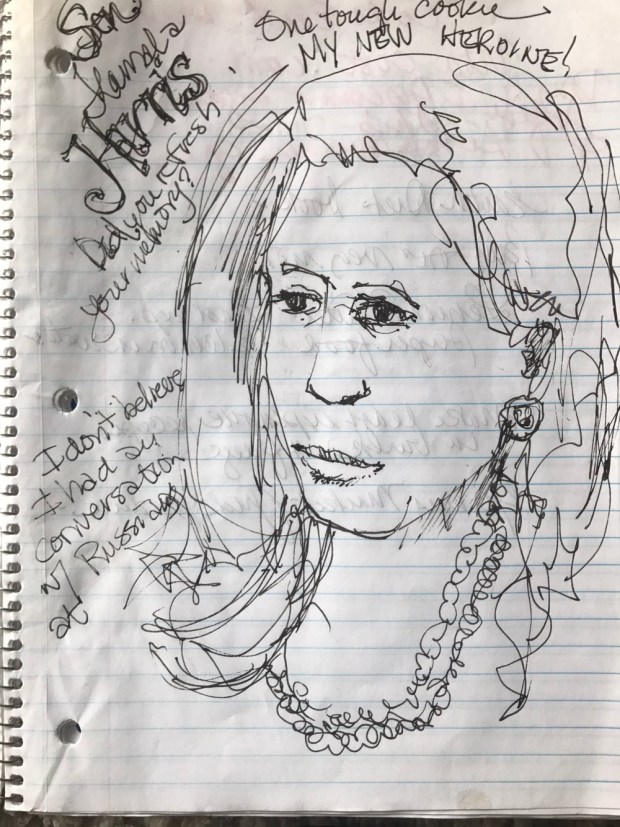 For a while I have been drawing the talking heads and writing down what they say at least some of it. I remember who’s up to what In this Russian hunt. And sometimes I draw them like today. I guess I should have drawn them in a sketchbook but they are in a notebook I bought for 10 cents at target a couple of years ago.