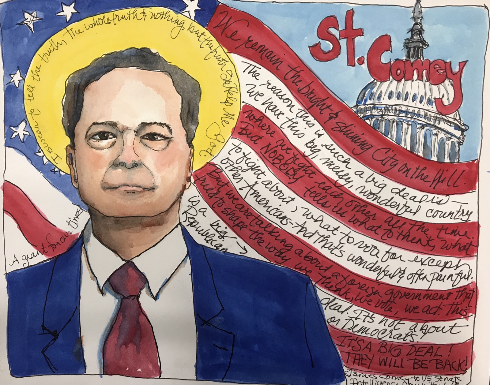 I dug into my mixed media art supply grove. Caran d’ache Neocolor ii to the rescue. I started coloring. I lightened him up. The only person that didn’t have some runs was Comey. 😳
