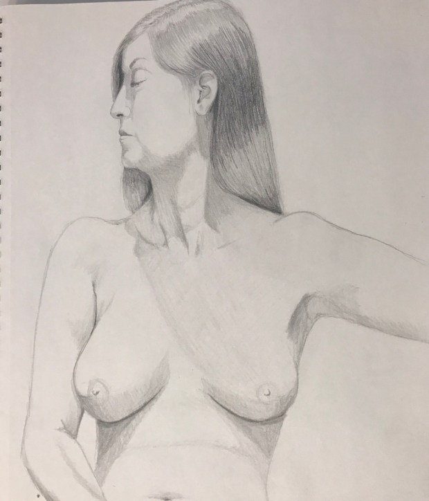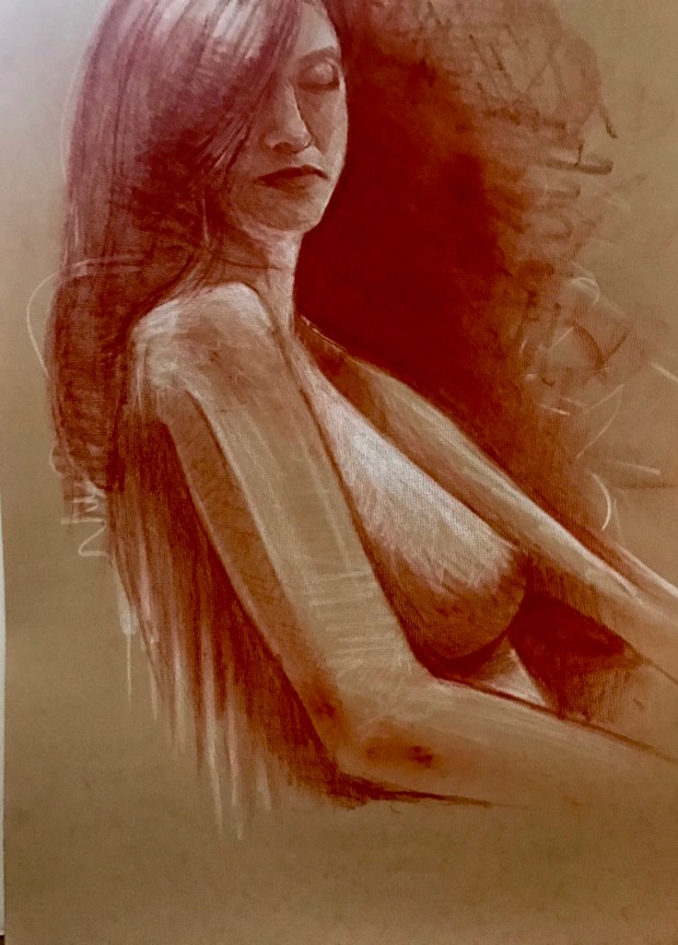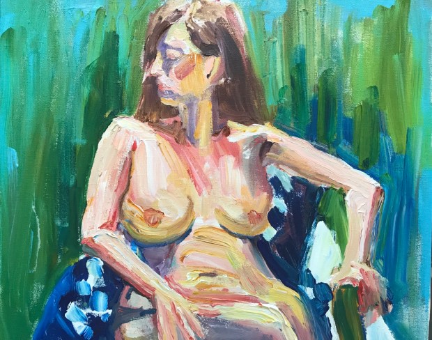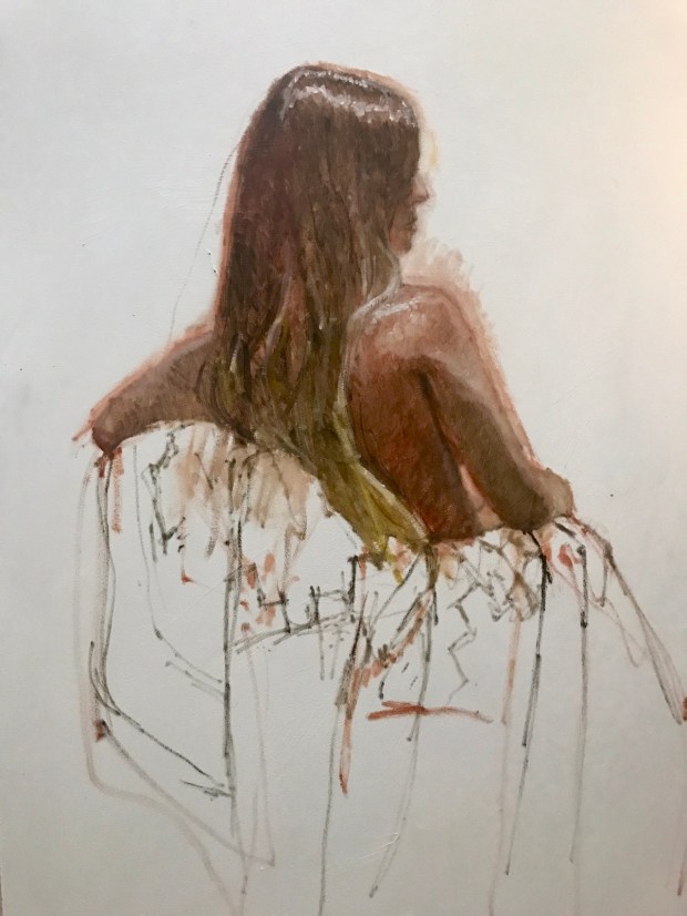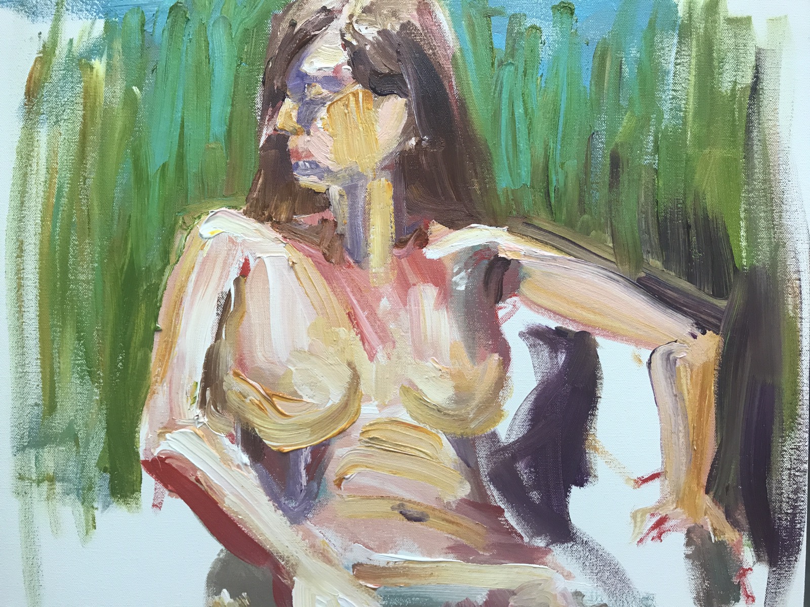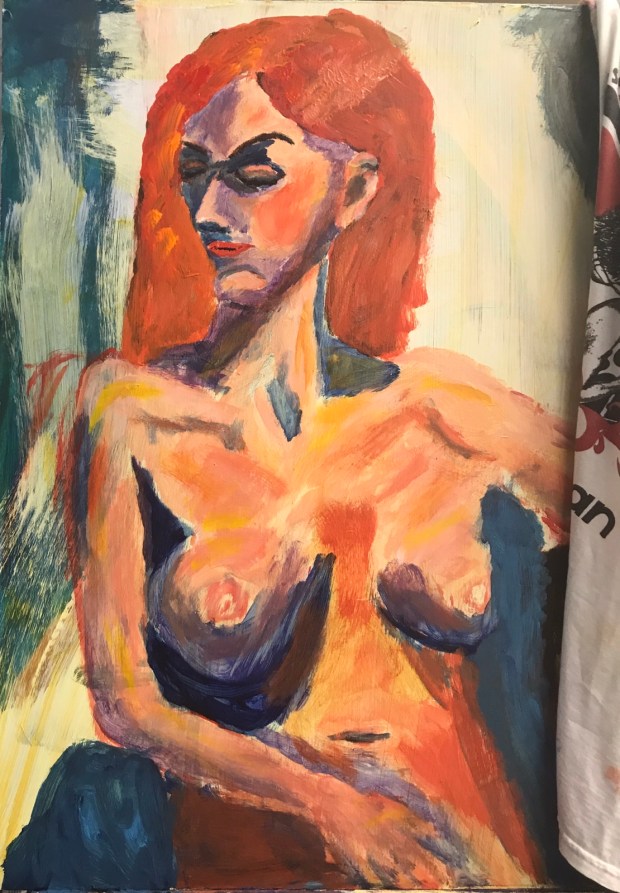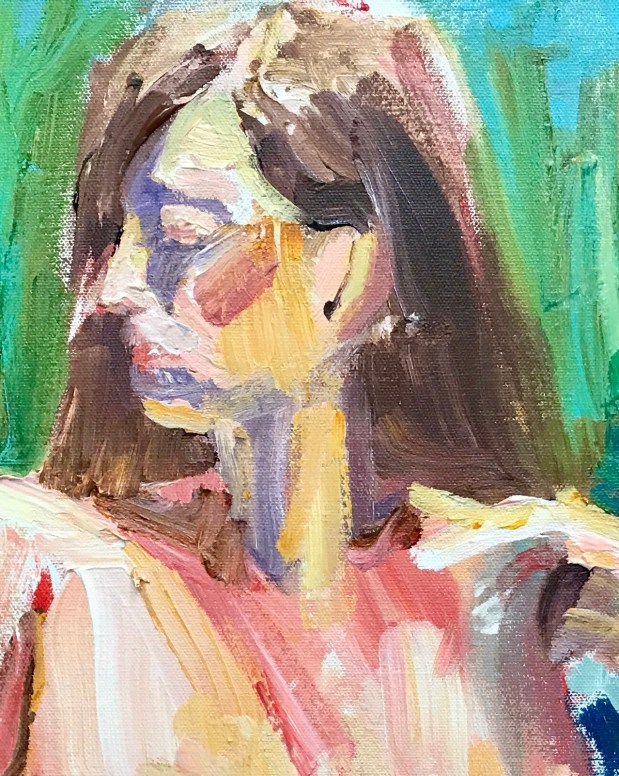 Slathering the paint on like cake icing. Lots of impasto. A little hippy and busty?! I moved that right arm at least three times. Scrapped it off and started over again and again and again.